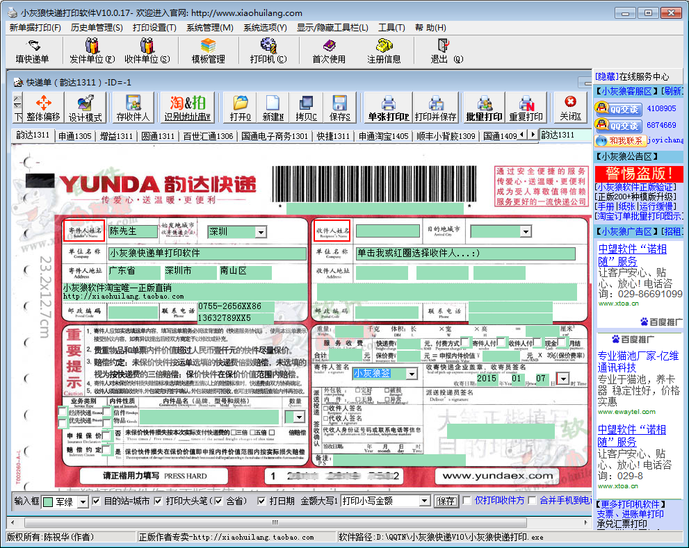 6、支持批量打印(重复打印多份、1发件人+多收件人批打、仅打印收件人或发件人);