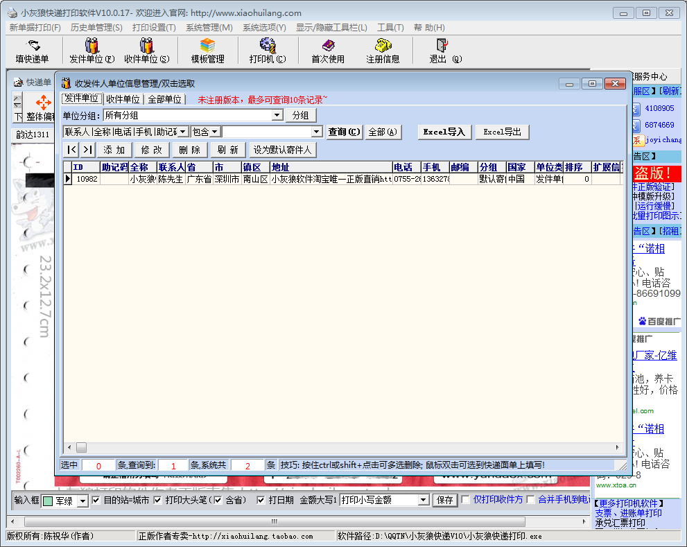 3、收发件人资料可存储10万个以上,随时方便重复调用;