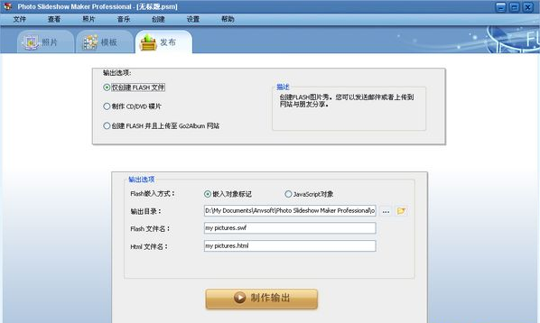 Photo Slideshow Maker Pro 可以在电脑上创建 SWF 格式惊人照片 Flash 幻灯片,刻录自动运行的 Flash 相册的礼物CD/DVD,构建一个 Web 画廊与动态的 SWF+ HTML + XML 文件惊人的 Flash 幻灯片,或上传幻灯片到我们的免费网络相册 Go2Album,然后嵌入幻灯片到 MySpace,博客,Friendster 和许多其他社交网站。Photo Slideshow Maker Pro 工具可以帮助您创建个人网站的幻灯片,相册,产品展示,网页横幅,业务演示,Flash引导和实现更多其他的Flash 幻灯片工作。