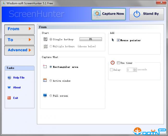 1、捕捉矩形区域,活动窗口或全屏,以及包括鼠标指针和设定的延时(秒)。您可以保存为BMP,JPG或GIF格式的图像,以及选择纯色或抖动.