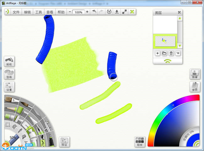 ArtRage模仿自然画笔的功能非常强大,它对各种画笔特性的模仿能力令人叫绝,不仅如此,它还可以模仿不同的纸张质地,让你完全感觉不出只在电脑中作画。它所画出来的效果和用颜料在纸上画的效果几乎一样。