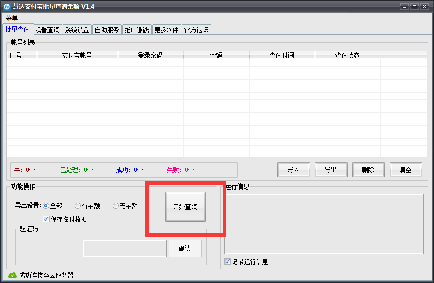慧达支付宝批量查询余额工具可以用来查询多个支付宝小号账户余额。软件操作完全可视化,可以看到每一个帐号的余额、查询时间、查询状态等。同时软件可以根据查询结果,分类导出保存。