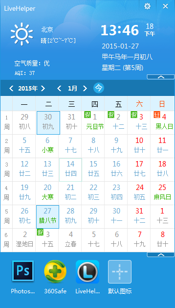 LiveHelper生活助手是一款风格清新的桌面日历软件,这款软件小巧易用,它为用户提供万年历、天气、时间等便捷生活信息,Live Helper致力于为用户提供贴心的电脑使用体验,是一款超实用的生活小助手,欢迎下载使用!