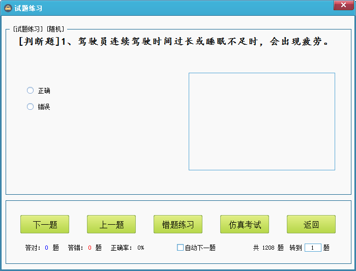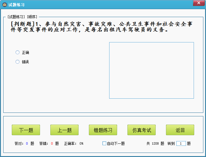 出租车资格证考试题练习系统是一款专门针对出租车汽车驾驶员从业资格而开发的模拟考试系统,考试内容一共有九个章节,采用了2014年最新出租车汽车驾驶员从业资格考试全国公共科目题库,软件提供了随机练习、顺序练习、仿真考试、错题练习等几种方式,让你能够全方面掌握所有题目,一次考过。