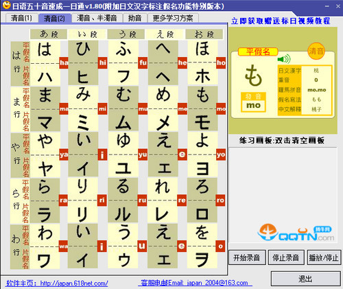 日语五十音速成一日通是一款共享软件,采用先进的立体自我激发式的先进教学理念,融合了视频教学与标准的真人发音,人与电脑的有机互动,包括了电脑语音复读,自由练笔等,在轻松愉快的环境下快速地学完标准日语五十音.从而为你进入更深的日语学习打下不可忽缺的坚定的基础.它面向所有想进入进入日语学习的用户,没有任何的功能限制。