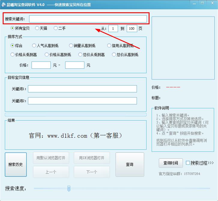 3、输入要查找的宝贝关键词(可以输入宝贝标题或卖家账号的关键词)。