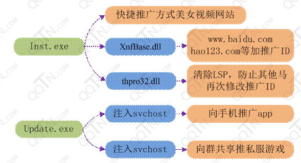 制造木马的最终目的一定是为了盈利,暗云木马运行后,会首先在桌面上释放一个名为“美女聊天室”的快捷方式,推广haomm.com网站以实现盈利;当用户使用浏览器浏览hao123.com、baidu.com等网站的时候,木马会擅自篡改网址链接,将网页导向其他网站,从而实现获利;除此之外,木马还能私自向安卓手机推广APP、向含有“私服”等关键词的QQ群上传共享文件,用这种推广方式获利。