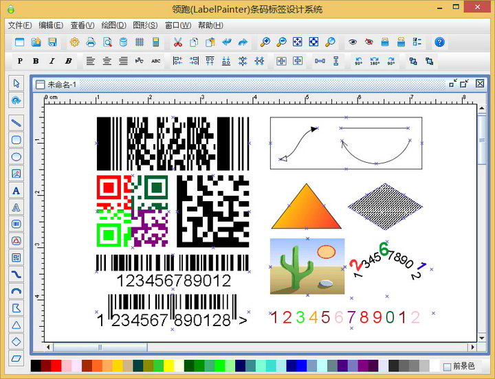 1、直观便捷的图形绘制功能。可以绘制矩形(圆角矩形)、椭圆(圆形)、菱形、三角形、平行四边形、线段、曲线、文字(弧形文字、随机色文字等。可设置字间距、行间距;可针对数据中单个文字进行颜色、字体、大小、倾斜度设置)、矢量文字(支持颜色渐变、底纹填充、边线控制等)等多达15种图形对象;图形可随意拉伸、压缩、旋转等;封闭式图形对象(矩形、椭圆、菱形、三角形、平行四边形、矢量文字等)支持渐变色、背景图案等填充方式;图形尺寸、位置、旋转角度可精确设置;数据类图形(普通文字、矢量文字、一维条码、电子监管码、二维码、图片)支持数据的批量生成或导入;图形编辑支持“对齐”、“等间距”等常规图像处理方法。