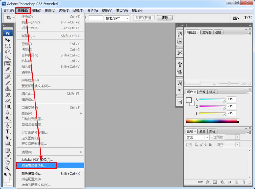 1、打开photoshop,选择编辑/预设管理器,打开预设管理器面板,如图: