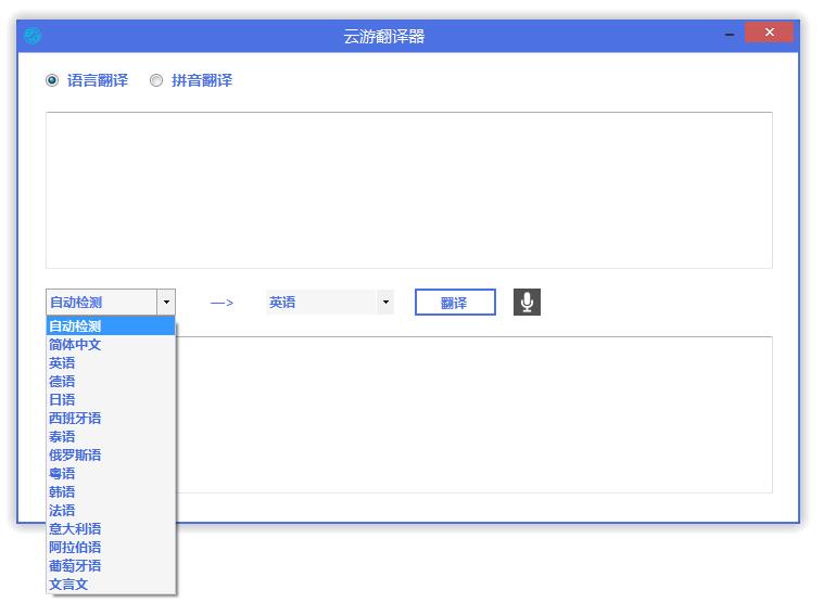 云游翻译器是一款由云游推出的专业翻译软件,这款软件可以帮助你快速进行语言翻译,支持简体中文、英语、德语、日语、西班牙语、俄语、韩语、葡萄牙语、阿拉伯语、粤语、文言文等十多种语言互译,另外还支持翻译发音,功能之强超乎你的想象!如果你还在寻找一款翻译软件的话,那么这款云游翻译器绝对是你的不二选择!