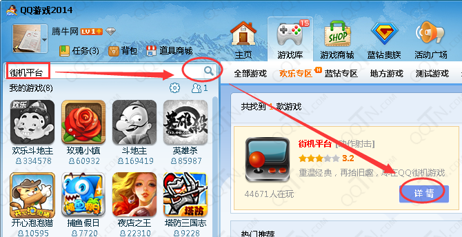 安装QQ游戏大厅,开启后在搜索框中输入“街机平台”,在右边的结果栏中会显示“街机平台”,点击查看“详情”