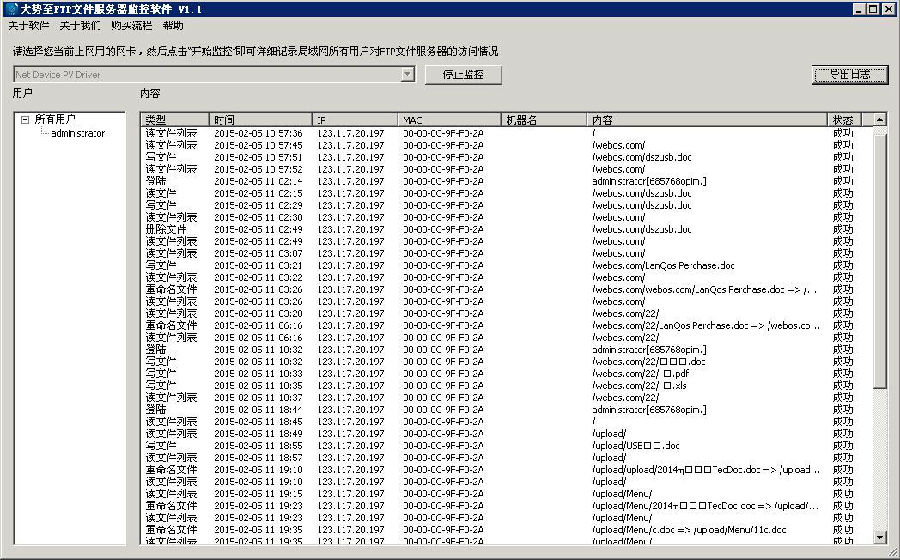 5、是当前国内操作最简单的FTP文件管理软件,软件界面只有三个按钮,只需要选择网卡、启动监控、导出日志,所有操作点点鼠标即可,适合国内各层次网络管理人员的需要。