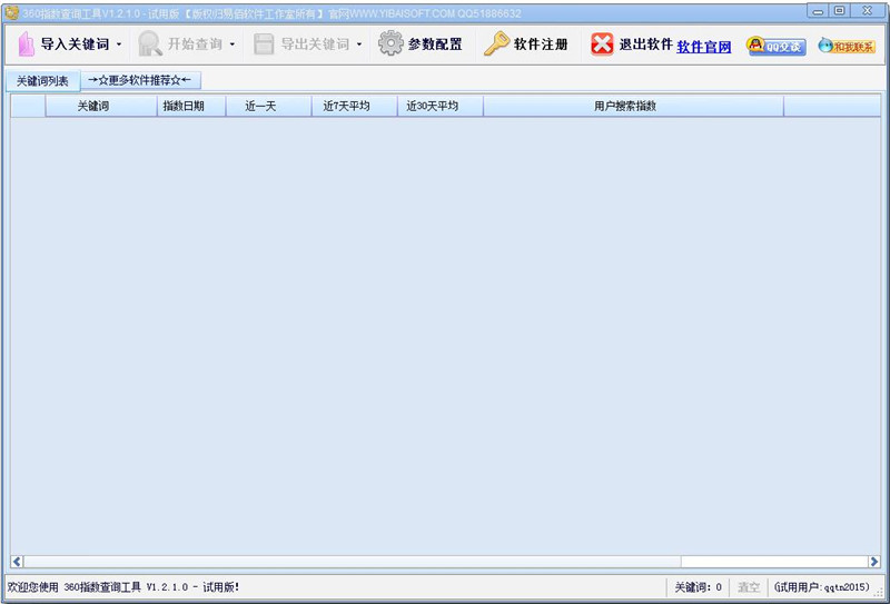 360指数查询工具是一款由易佰软件制作推出的360指数查询软件,这款软件可以帮助你批量查询、采集、挖掘和导出360指数,目前此软件为试用版,登陆前需注册,下面有本站的测试号,欢迎各位试用体验,VIP用户使用软件无需绑定电脑,可以换电脑使用软件,但只支持同时在一台电脑运行,类似QQ。