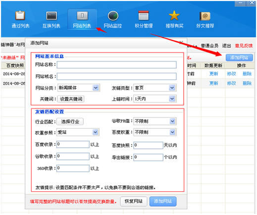 第一步:登陆“换链神器”进入“网站列表”点击“添加网站”并设置换链匹配条件,添加完网站后系统会在十分钟后自动更新所添加网站SEO数据,或者手工点击“更新”