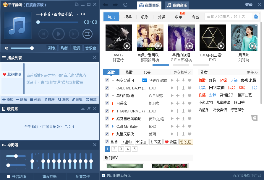 唱歌能够消除烦闷,风靡一时的千千静听成为了过去,随之改名为百度音乐,也带来了全新的音乐体验,百度音乐继承了千千静听的所有优势,同时增加了智能音效匹配和智能音效增强、MV功能、歌单推荐、皮肤更换等个性化的