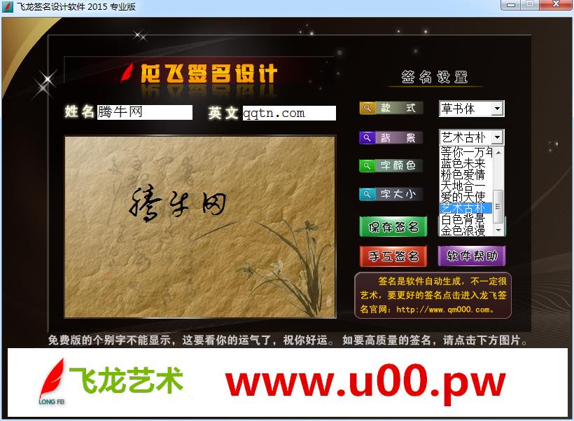 飞龙签名设计软件是一款2015年最新的免费设计签名软件,这款软件可以帮你设计出各种漂亮的艺术签名,飞龙签名设计软件不仅有多种好看的签名字体,如公文签、一笔签等等,而且能自由改变签名背景,基本可以当成你的个人标签或者说是形象代表。制作成电子档后,完全可以当成个人水印或者LOGO使用。欢迎下载!
