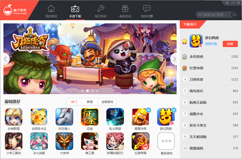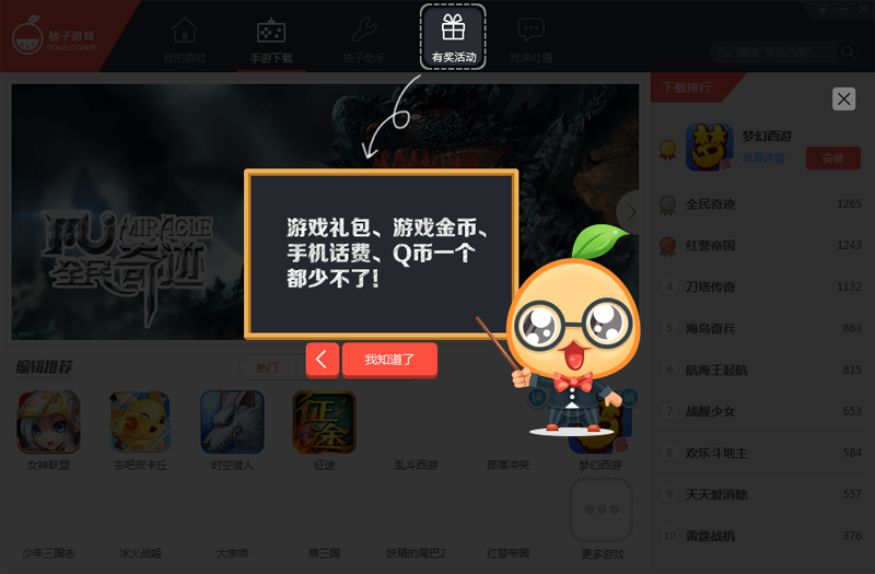 柚子游戏是一款电脑玩手游软件,其主要将功能分为我的游戏、手游下载、柚子助手、有奖活动以及我来吐槽五大类,在pc上玩手游更给力!