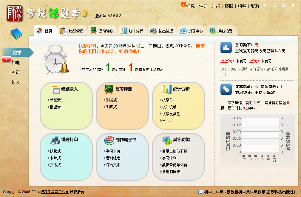 智能错题本2是一款高效智能的错题管理软件,提供错题录入、复习评测、统计分析、错题打印、学习计划制定、电子书制作等多项功能;强大的错题录入编辑功能和独特的错题复习评测系统。为你打造一款个性化高效智能错题管理软件。