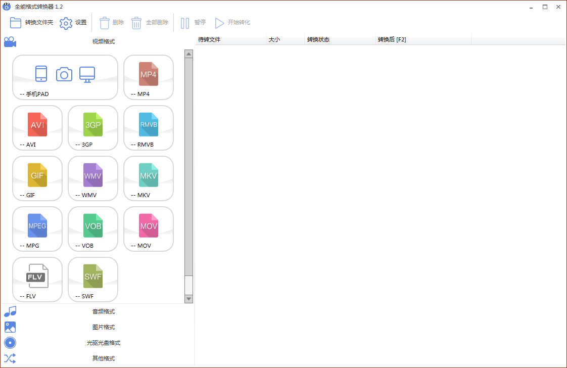 全能格式转换器是一款完全免费的万能格式转换软件,支持视频格式、音频格式、图片格式、光驱光盘格式等多种类型的多媒体文件格式转换。转换速度快、文件质量有保障、使用操作方便简单,适合所有用户使用。