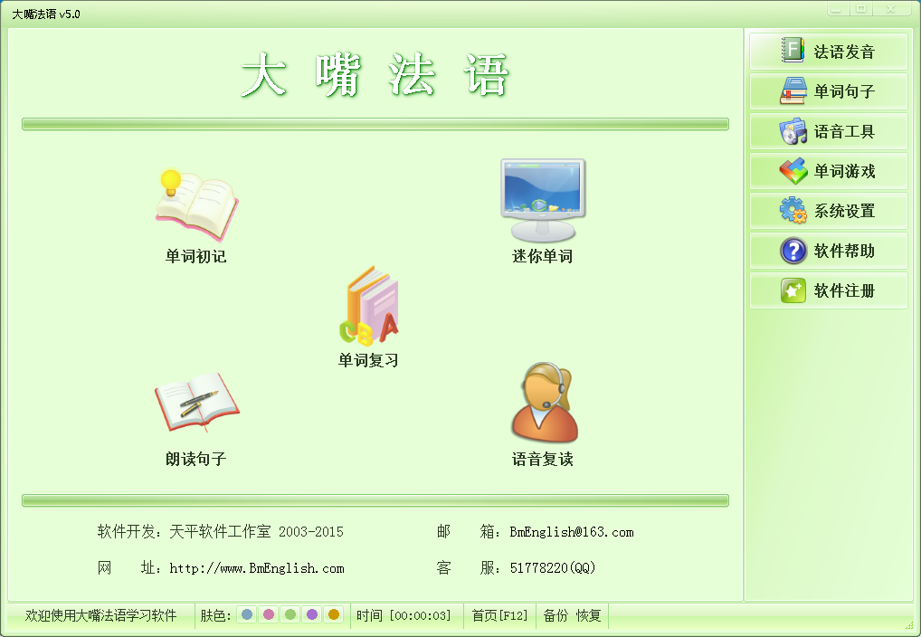 大嘴法语学习软件主要向法语学习者们提供法语发音、单词句子、语音工具、单词游戏四大功能,从听、说、读、写、背、译、玩七个方面帮助你快速学习法语。