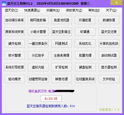 U盘扩容检测、注册表清理、系统优化、挂机锁、快速命令等、电脑时间校准、顽固文件粉碎、网速测试、驱动精灵、修复疑难杂症、调用近百种常用经典软件、蓝天空工具箱全面支持主流操作系统,同时也支持PE系统下运行,功能完善,是计算机爱好者的必备利器。
