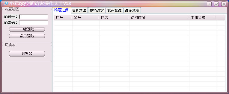 小易QQ空间访客操作大全是一款强大的2015最新QQ空间查看器,这款软件功能非常丰富,它可以帮助你查看QQ空间各种访客信息,比如:谁看过我、我看过谁、被挡访客、我在意谁、谁在意我,让你享受黄钻空间的特权,快速查看被挡访客,是一款非常实用且强大的QQ空间管理查看器。