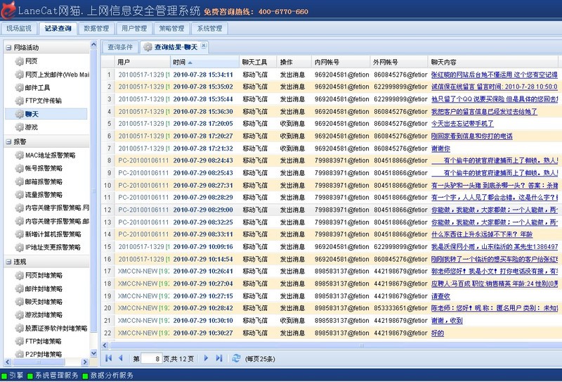 IM聊天除了影响工作效率,其带来的敏感信息泄露问题也给企业管理提出了严峻的挑战。LaneCat网猫能够完整记录MSN、QQ、飞信、yahoo通等聊天内容及文件传输内容,并支持对聊天记录的详细查询。