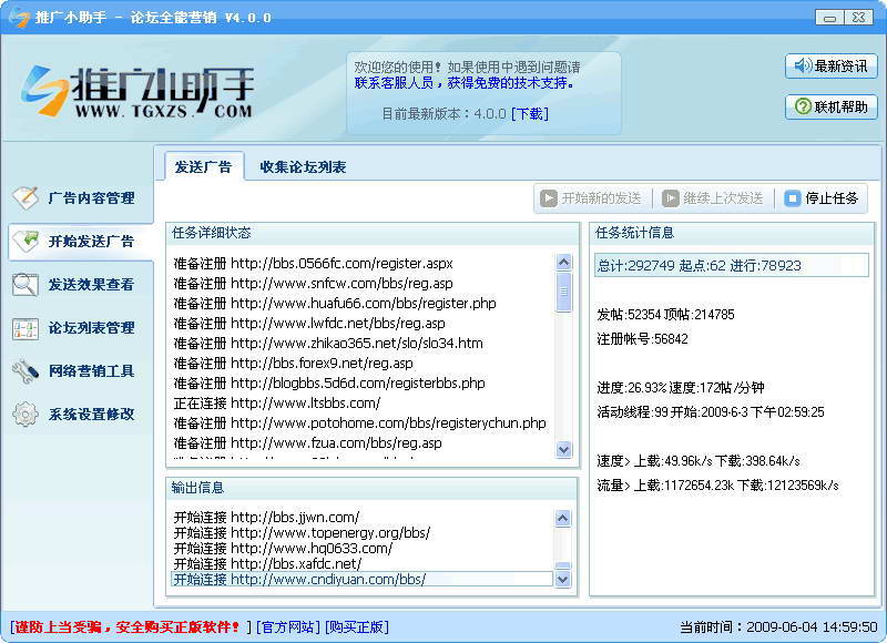 您所选择的《论坛全能营销》是《论坛群发》的高端加强版本,并在此基础上增加了:论坛群顶帖(帖子回复)、Email帐号激活支持、多媒体广告内容支持、论坛列表行业分类、论坛帐号分享计划、登录状态保持技术,等高端功能。