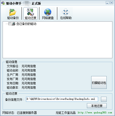 驱动小帮手是一款电脑驱动管理软件,软件提供驱动备份、驱动还原、网络硬盘等功能。用户可以使用本软件将驱动备份到本地或是网络硬盘。同时软件还可以查看每一个驱动的详细信息,包括驱动名称、生产厂商、发布厂商、发布日期、驱动版本等信息。