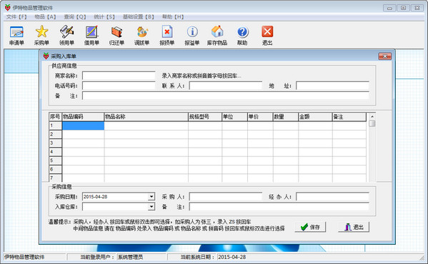 伊特物品管理软件是伊特软件推出的一款物品管理系统,这款软件专门针对企事业单位开发设计,它能够帮助你智能管理后台库存,支持快捷录入和查询物品,评外还支持物品申请单、采购单、领用单、借用单、归还单、调拨单、报损单、报溢单、库存报表,紧紧围绕物品管理各个环节进行监控。