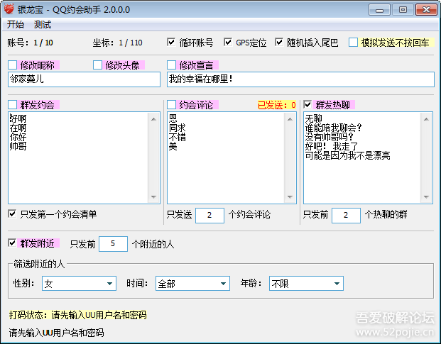 QQ约会助手是银龙宝推出的一款QQ约会群发助手,这款QQ约会助手专门对广大Q友设计制作,它可以帮助你批量循环登陆QQ、虚拟GPS定位,给附近的人一键发送消息,批量约会评论、抢楼,给约会看过的人发送信息,还能热聊群发发送信息,是一款QQ约炮神器,欢迎免费下载使用!