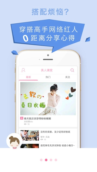 【美人课堂】达人网红图文分享穿衣搭配潮流、美妆教程、护肤心得和瘦身秘诀。