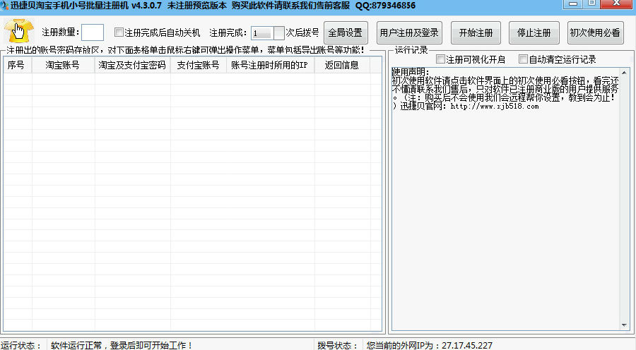 迅捷贝淘宝小号批量注册机是一款专门针对淘宝推出的批量注册小号工具,这款软件可以帮助你一键批量注册淘宝小号,这款工具内置宽带拨号功能,可以自动更换IP,批量注册淘宝小号,程注册过程模拟手工注册,注册成功一个号后软件自动清空注册时接入淘宝的cookies,非常方便好用!