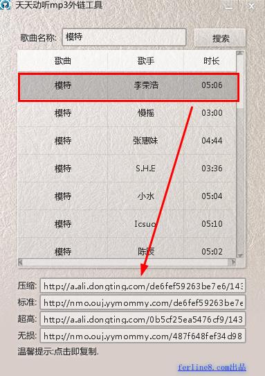 天天动听mp3外链工具是一款专门针对天天动听的音乐外链获取工具,这款软件界面美观简洁,使用起来非常方便,你可以直接搜索歌曲,获取歌曲外链之后,双击鼠标复制即可使用迅雷下载,当然你也可以用于QQ空间的背景音乐,后面可能还会提供其它mp3外链工具,欢迎各位下载使用。