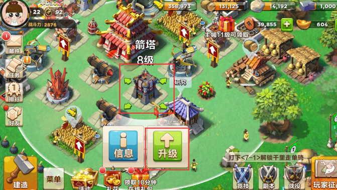 妹子这里以升级“箭塔”为例,点击主城中“箭塔”图案并会出现升级与信息字样,如图所示