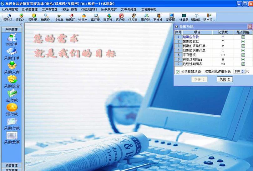 对超期订单、超期应收款、应付款、将要过期商品和已过期商品等系统实时提醒。