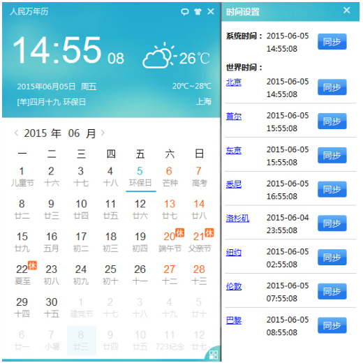 人民万年历是一款绿色简洁、界面美观大方的日历万年历软件,它为用户提供天气预报、公农历对应、假日节气查询、放假安排查询等生活功能,另外还支持自由换肤,界面不仅美观时尚,而且操作起来非常简单,小巧不占用系统资源,是一款非常不错的电脑日历软件。