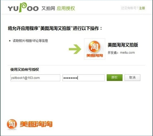 然后,通过简单的应用授权即可在美图淘淘中直接登陆又拍网。登陆后即可将刚刚处理好的宝贝图片本地传送至又拍相册。