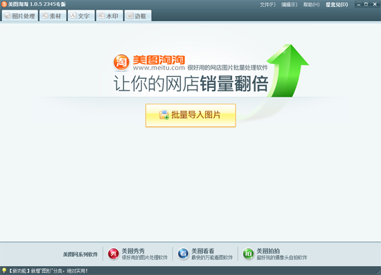 淘宝图片处理软件能够帮助淘宝店家修改图片,是特别为淘宝卖家量身定做的。平常我们使用的图片处理软件对与处理淘宝图片起来相对比较麻烦,而淘宝图片处理软件正中卖家下怀,将图片批量文字设置、水印设置、加边框等