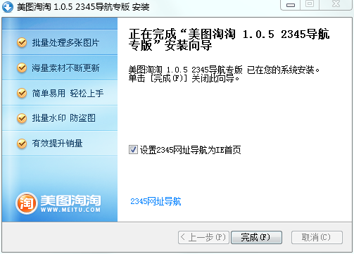 美图淘淘2345专版与正式版功能一样,只是在安装的时候添加了2345网址导航,安装完成后软件默认将2345网址导航设为IE星空最新网上盘口。