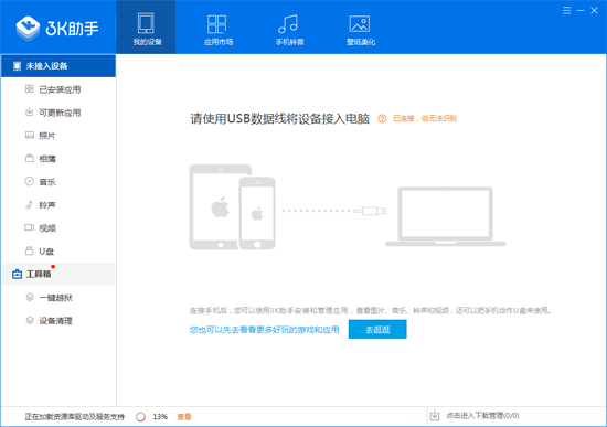 3K助手pc端帮助用户在电脑上便捷管理ios设备,主要提供设备管理、应用市场、手机铃音、壁纸美化等功能。用户尽可安心享受越狱后的精彩,它是太极越狱唯一推荐助手哦!
