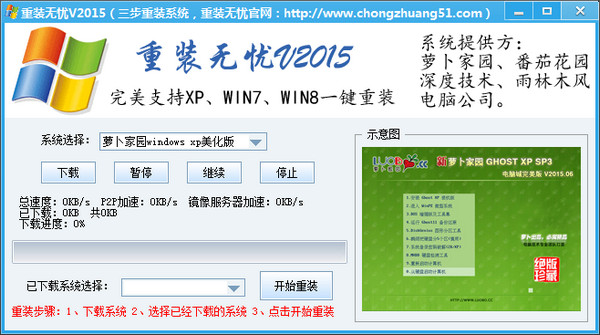 重装无忧(原DIY重装手)是一款用于在线重装系统的实用工具,通过它你可以自行选择XP/Win7/Win8系统进行安装,方便快捷。重装的系统都是时下最新版本,系统文件定时更新,非常适合电脑小白。如果你想重装系统的话不妨来试试这款2015最新的重装无忧吧!