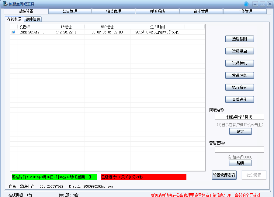 新起点网吧工具是一款专为网吧管理员推出的智能网吧管理系统,这款最新的新起点网吧工具操作简单,功能强大,功能包括呼叫网管、呼叫服务员、技术员等,同时还有抽奖系统、歌曲上传系统、网吧公告等,总之是一款非常不错的网吧管理工具!