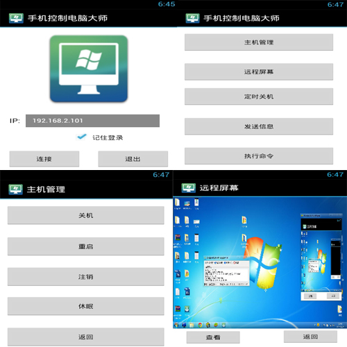 手机控制电脑大师是一款安卓手机控制电脑的软件,可以关机、重启、注销、休眠、查看电脑桌面、发送消息到电脑、执行CMD命令等,手机控制电脑大师也支持控制电脑定时关机。