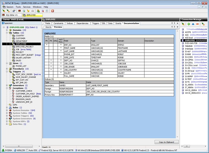 在这里,您可以检查每个数据库对象,包括其详细属性。一些对象,您可以编辑过。还可以提取所有对象的元数据,包括表的数据。