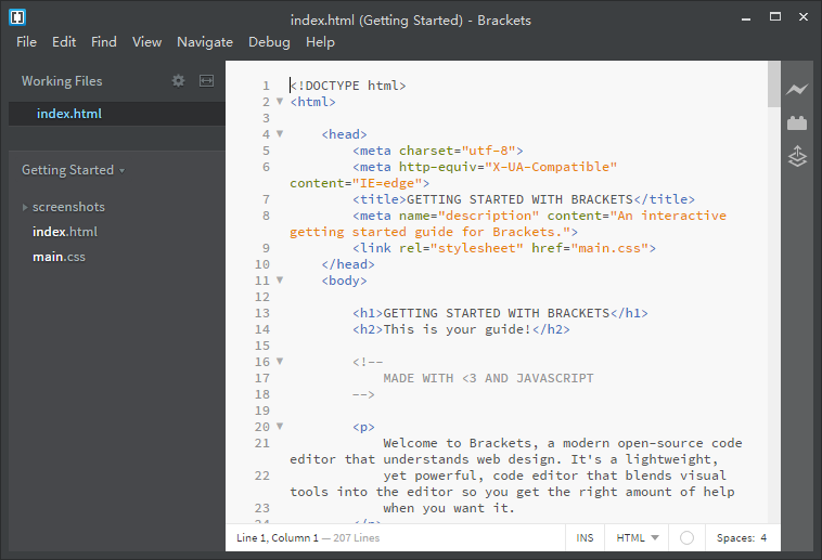 Brackets 是一个免费、开源且跨平台的 HTML/CSS/JavaScript 前端 WEB 集成开发环境 (IDE工具)。该项目由 Adobe 创建和维护,根据MIT许可证发布,支持 Windows、Linux 以及 OS X 平台。Brackets 的特点是简约、优雅、快捷!它没有很多的视图或者面板,也没太多花哨的功能,它的核心目标是减少在开发过程中那些效率低下的重复性工作,例如浏览器刷新,修改元素的样式,搜索功能等等。和 Sublime Text、Everedit 等通用代码编辑器不一样,Brackets 是专门针对 WEB 前端开发而生……