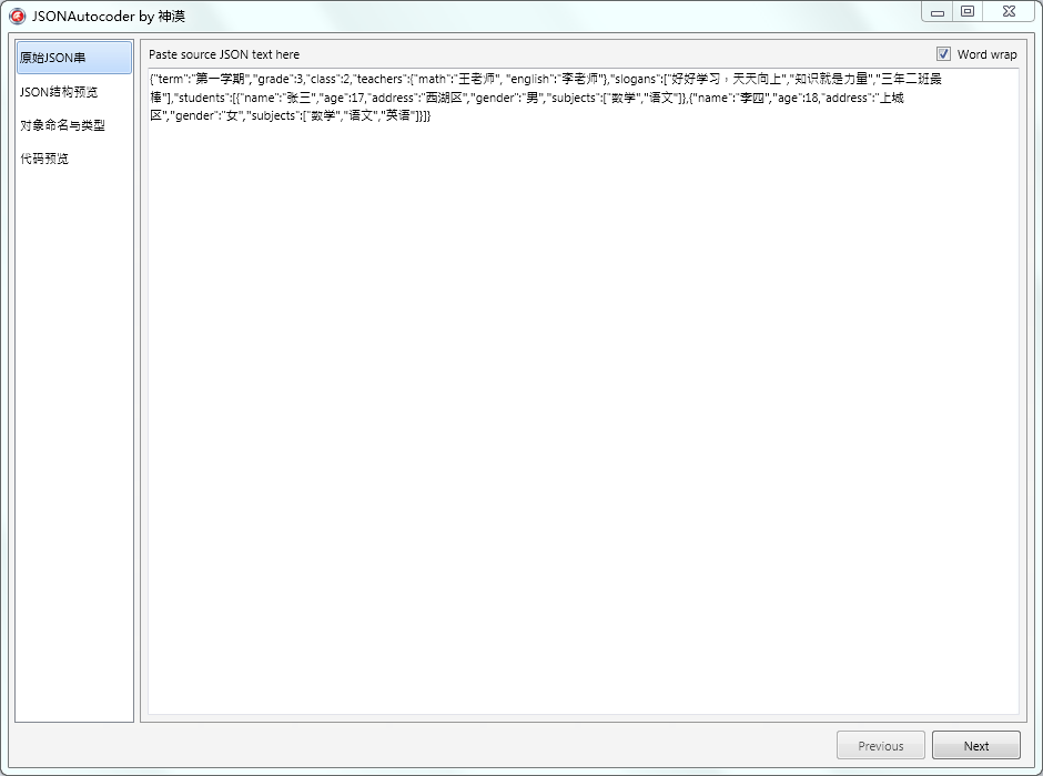 “JsonAutocoder”是作者“神漠”制作的一款Json解析工具,提供了原始JSON串、JSOM结构预览、对象命令与类型以及代码预览等功能。