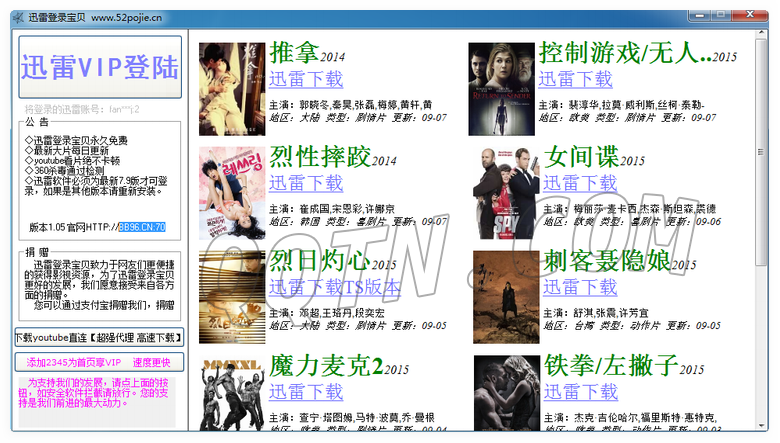 迅雷登录宝贝是一款自动获取最新有效的迅雷VIP账号来登陆迅雷进行下载的工具。虽然界面很丑,就像病毒软件一样,但这并不影响它的实用。又需要的朋友们可以下载来看看。