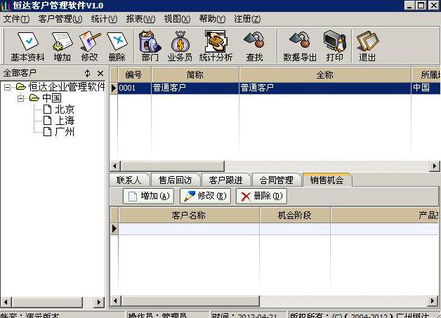 恒达客户管理系统是一款集客户存档、业务记录一体的先进软件,该软件可以将有可能成为客户的人变成真的客户,通过这种方式来提高销售业绩、提高客户对公司的信任度,从而提高企业在市场上的竞争力。