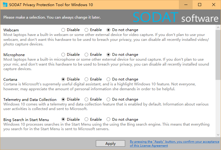 win10隐私保护工具SODAT Privacy Protection Tool是专为 Windows 10 设计的隐私和权限管理工具。能够控制 网络摄像头、麦克风、微软小娜、bing开始菜单搜索等数十项功能。全面保护你的隐私。注意:win10之前的操作系统无法使用。